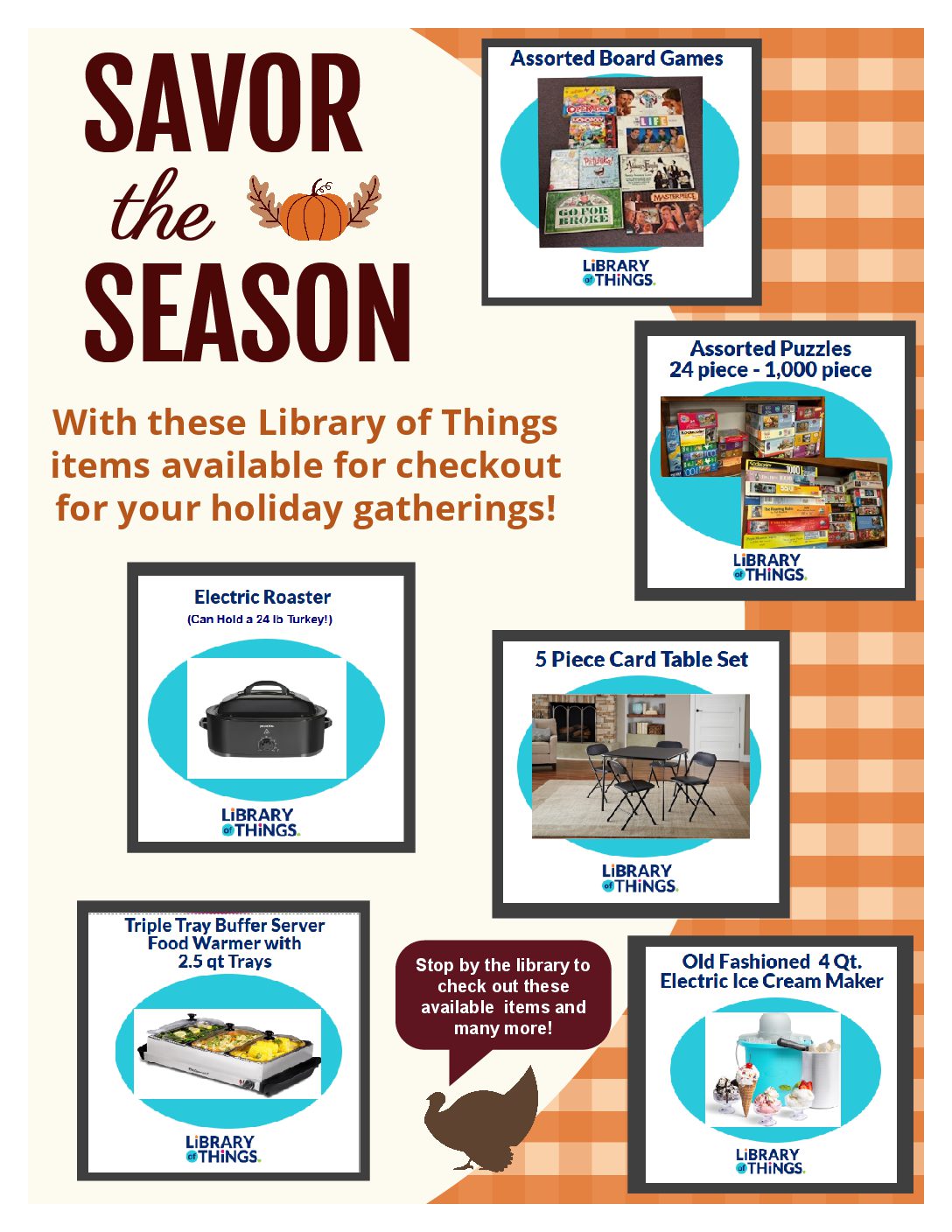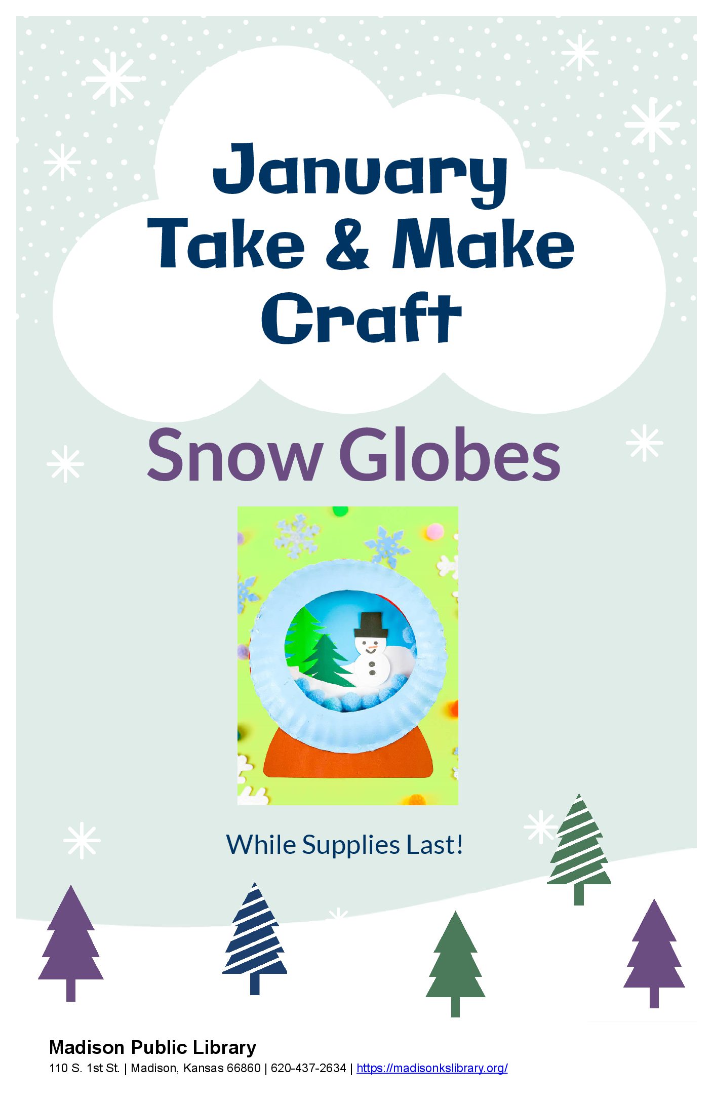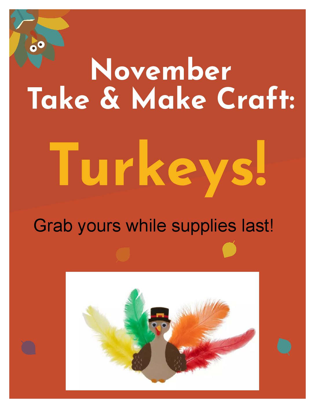 Take & Make Craft for Kids: a different craft is bagged up each month and located for pick up at the front entrance