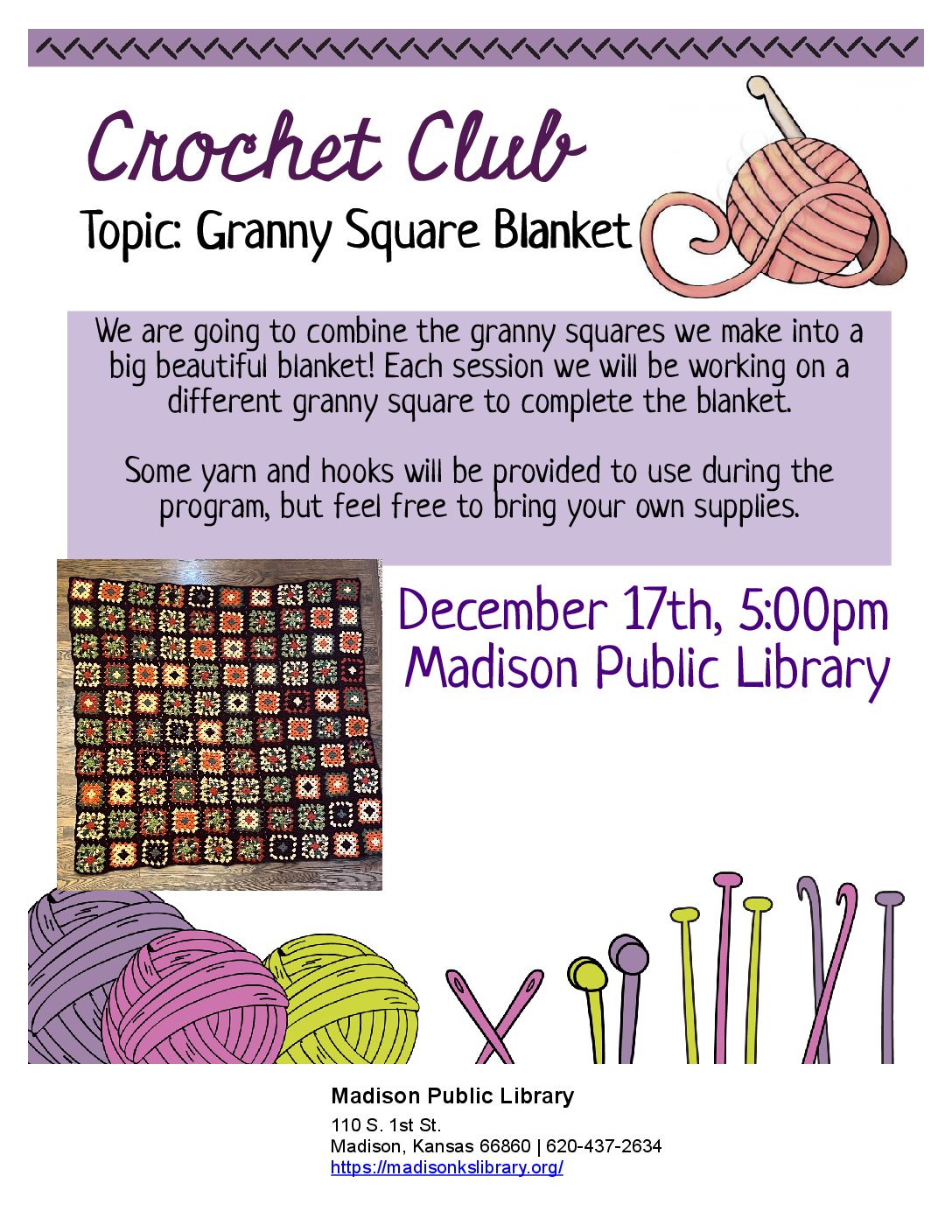 Crochet Club: Monthly meetup for beginners to learn to crochet or have questions answered by experts! Dates vary from month to month.