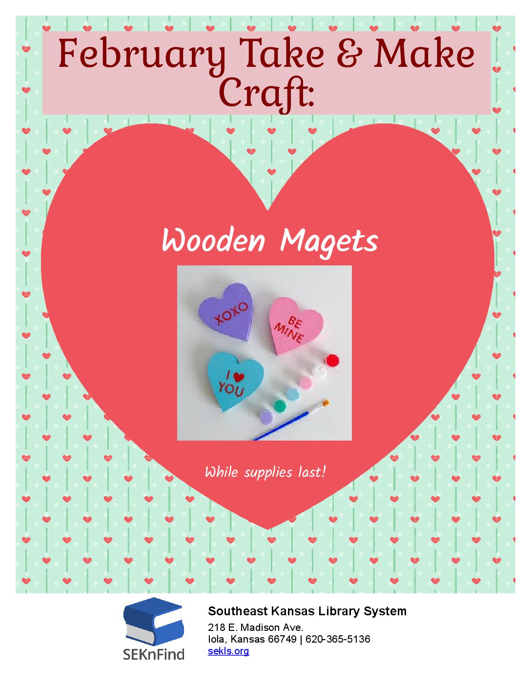Take & Make Craft for Kids: a different craft is bagged up each month and located for pick up at the front entrance
